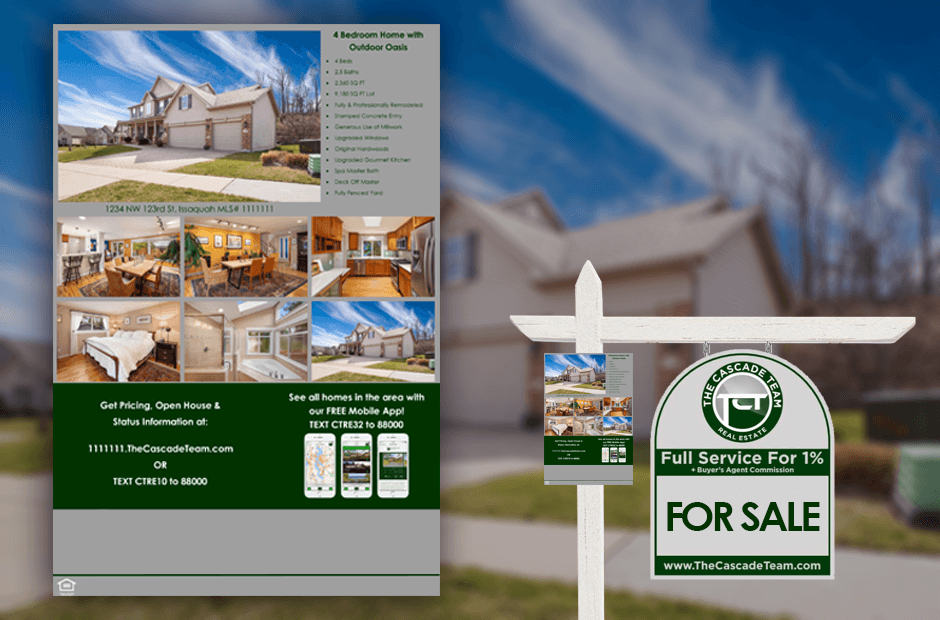 Our permanent Smart Flyers, never run out, get soggy when it rains, and are bigger than paper flyers. They feature large photos and lots of details about the property. Buyers can text for even more info and photos and also chat with your Cascade Team agent.